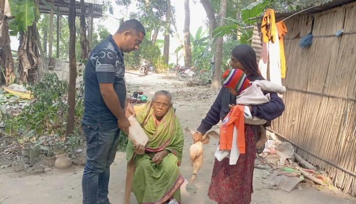 বার্তা ডেস্ক: বোয়ালমারী উপজেলার ময়না ইউনিয়নের খরসুতি গ্রামের সেই খ্রিষ্টান পরিবারটির পাশে দাঁড়ালেন সুমন রাফি। দুঃখ দুর্দশা কে নিত্য সঙ্গী বানিয়ে মানবেতর জীবন যাপন শিরোনামে বিভিন্ন গণমাধ্যম ও সামাজিক যোগাযোগ মাধ্যমে সংবাদ প্রকাশিত হওয়ার পর পরিবারটির খোঁজ খবর নেন ও তাদের পাশে দাঁড়ান তিনি। তিন যুগের অধিক সময় জরাজীর্ণ ঘরে মানবেতর জীবন যাপন করলেও ভাগ্য ফিরেনি পরিবারটির। খ্রিস্টান মিশনারীর একটি জায়গায় বসবাস করলেও দারিদ্র্যের নির্মম কষাঘাতে কখনো অনাহারে, কখনো অর্ধাহারে থাকে এই পরিবারের অধিকাংশ সদস্য। পরিবারটির প্রধান কাঙ্গাল কর্মকার মারা গেছে প্রায় আট (৮) বছর আগে। তার স্ত্রী রাজলক্ষ্মী কর্মকার এখন পরিবারটির প্রধান। এই দম্পতির রয়েছে সাত (৭) ছেলেমেয়ে, যার মধ্যে রয়েছে চার ছেলে ও তিন মেয়ে। অধিকাংশ ছেলেমেয়েই থাকে দূরে, রাজলক্ষ্মীর খোঁজ খবর রাখে না। দুই ছেলে, পুত্রবধূ ও নাতিনাতনি নিয়ে তার সংসার। জরাজীর্ণ ঘর একটু বাতাসে দোল খেয়ে ভেঙ্গে পড়ার উপক্রম হয়। বড়দিন উপলক্ষে পরিবারটির জন্য নতুন কাপড়, মুরগী, কাঁচা বাজার ও অন্যান্য খাদ্য সামগ্রী তাদের কাছে পৌঁছে দেন সুমন রাফি এবং ভবিষ্যতে পরিবারটির পাশে থাকবেন বলে জানান। এই বিষয়ে দেশ রূপান্তর পত্রিকার বোয়ালমারী প্রতিনিধি দীপঙ্কর পোদ্দার অপু জানান, সুমন রাফির সহযোগিতা পেয়ে রাজলক্ষ্মী কর্মকার বেশ আনন্দিত ও পরিবারের বেশ উপকার হয়েছে। তার এই ধরনের মানবিক কাজ সমাজের অন্যান্য মানুষের জন্য উৎসাহ অনুপ্রেরণার। সুমন রাফি জানান, মানবিক দায়বদ্ধতা থেকে আমি তাদের পাশে দাঁড়িয়েছি। ভবিষ্যতেও সামর্থ্য অনুযায়ী তাদের পাশে থাকবো ।